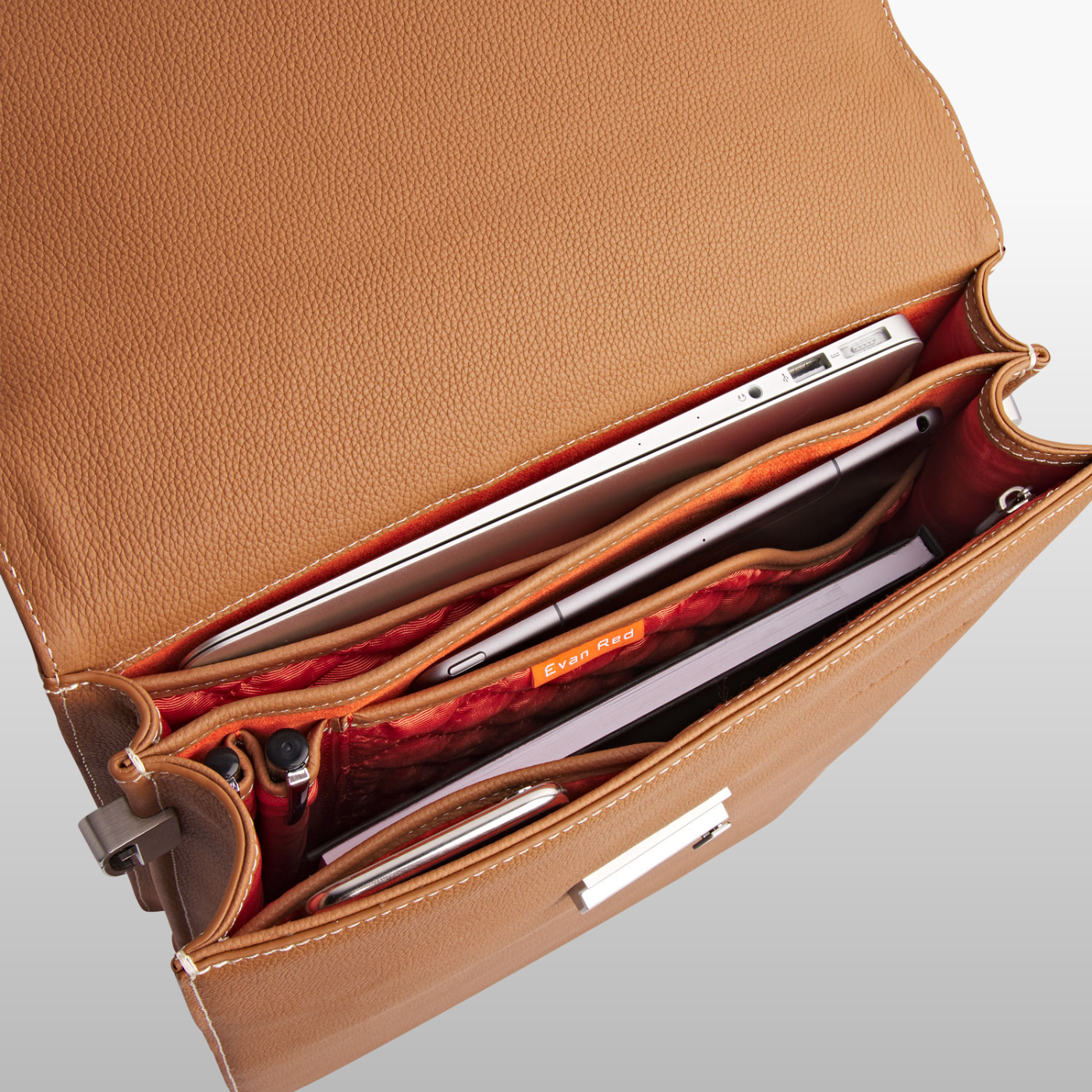 De London Briefcase is perfect voor een MacBook van 13" of 14", een iPad, een notitieblok en andere dagelijkse benodigdheden, dankzij 11 slimme binnenvakken. Grotere laptops tot 15,6" passen in het hoofdvak, maar niet in het gevoerde laptopvak. De tas wordt geleverd met een afneembare schouderband van 3 cm (1,18") breed.